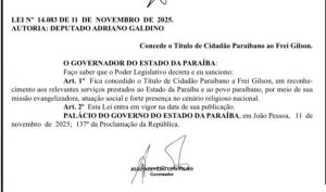 O governador João Azevêdo sancionou a lei que concede o Título de Cidadão Paraibano ao Frei Gilson. A homenagem, proposta pelo deputado Adriano Galdino, foi publicada no Diário Oficial desta terça-feira (11).